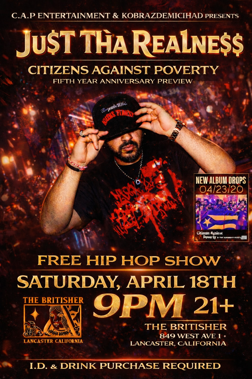 Ju$t Tha Realne$$ cares deeply for his community, his name is true to his approach, and to celebrate this new release for the neighbourhoods across America, fans can attend the Official Launch Party, to see the man himself on stage with a Live Band, on April 18th at 9PM, at The Britisher 849 W Ave I, Lancaster, CA 93534.
